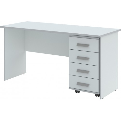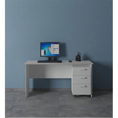Стол письменный выполнен из ламинированной ДСП. Состоит из столешницы, двух боковых опор и поперечной царги. Толщина столешницы - 16 мм. Дополнительно может комплектоваться подкатными тумбами.