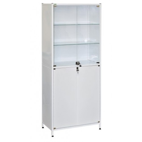 Шкаф имеет два отделения, каждое из которых имеет две двери с замком, верх-стекло/низ-металл. Полки в верхнем отдделении стеклянные, в нижнем - металлические.