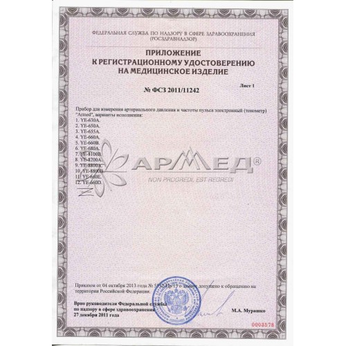 Прибор для измерения артериального давления и частоты пульса электронный (тонометр) «Armed» YE-660Е (с речевым выходом, с адаптером)