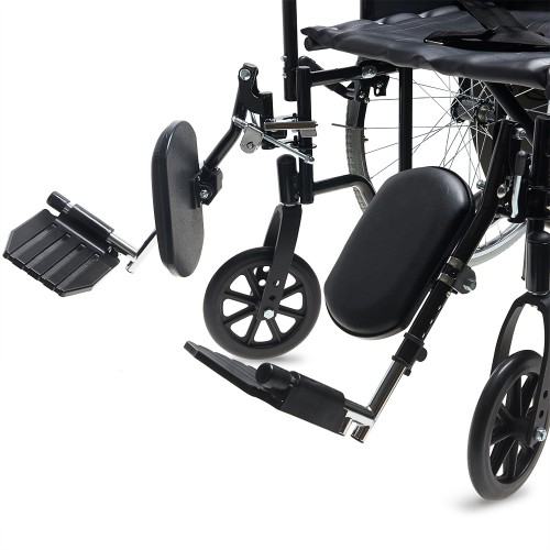 Кресло-коляска оснащена съемными, откидными, регулируемыми по высоте и углу наклона подножками с мягкими упорами для ног.